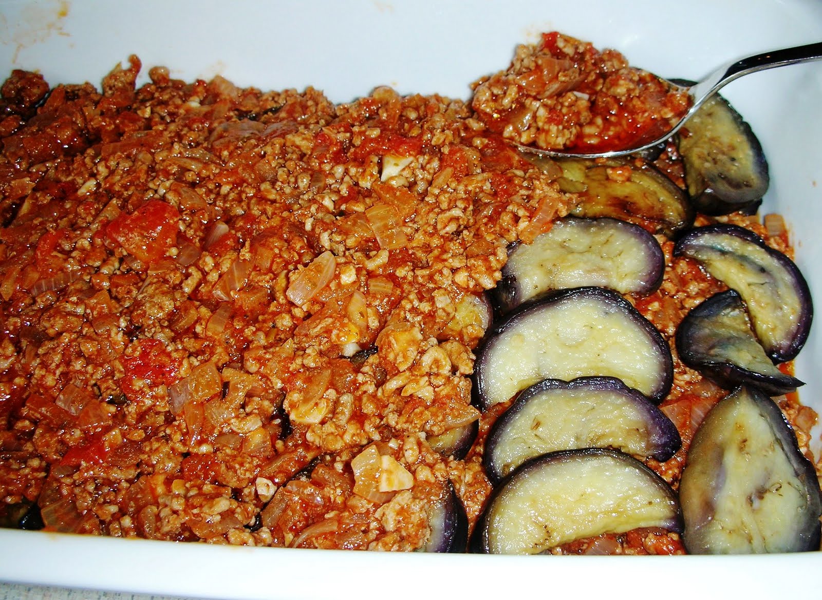 Layer the aubergines and the ground meat in an ovenproof dish, starting with a layer of aubergines. You can prepare up to this stage a day in advance or ahead of time.