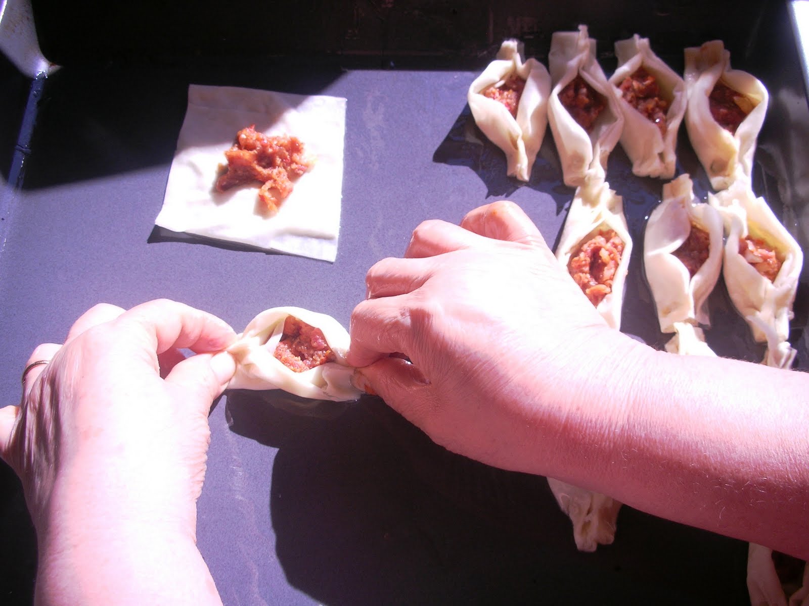 Put a spoonful of meat mixture in the middle of each 5cmx8cm pastry sheet (some filo sheets are thinner than others; you can put two filo sheets on top each other if it’s too thin. If you are using yufka, just one sheet should be sufficient). Wet your fingers from the bowl of olive oil & water mixture. Seal both ends of the pastry with your wet fingers. You should now have a shape of a small boat with the mixture in the middle. Repeat this for the rest of the mixture and pastry sheets.