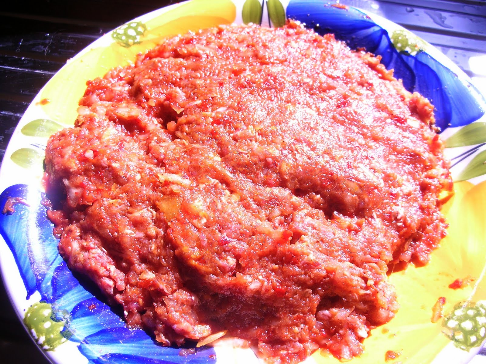 In a bowl, mix the grated onion, ground beef, tomato paste, season with salt and ground black pepper. Really knead well with your hands, until all the ingredients combined.