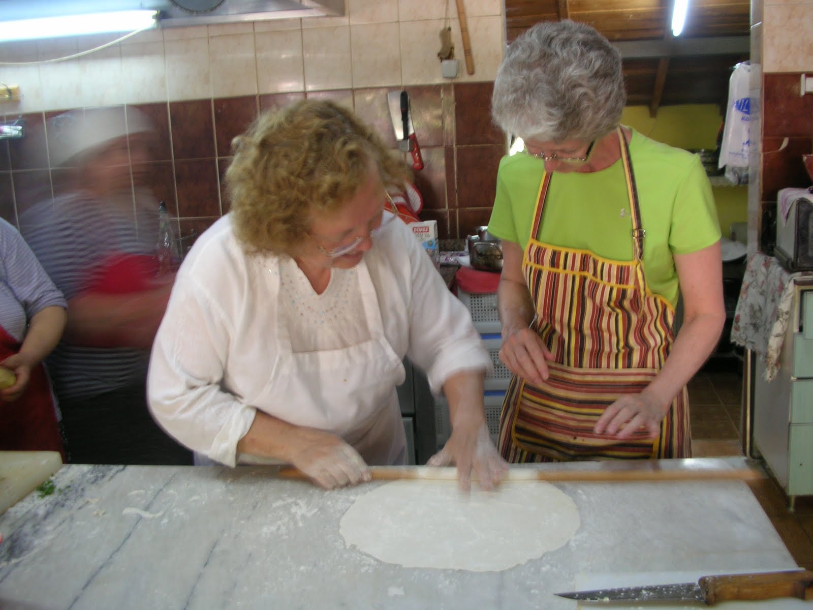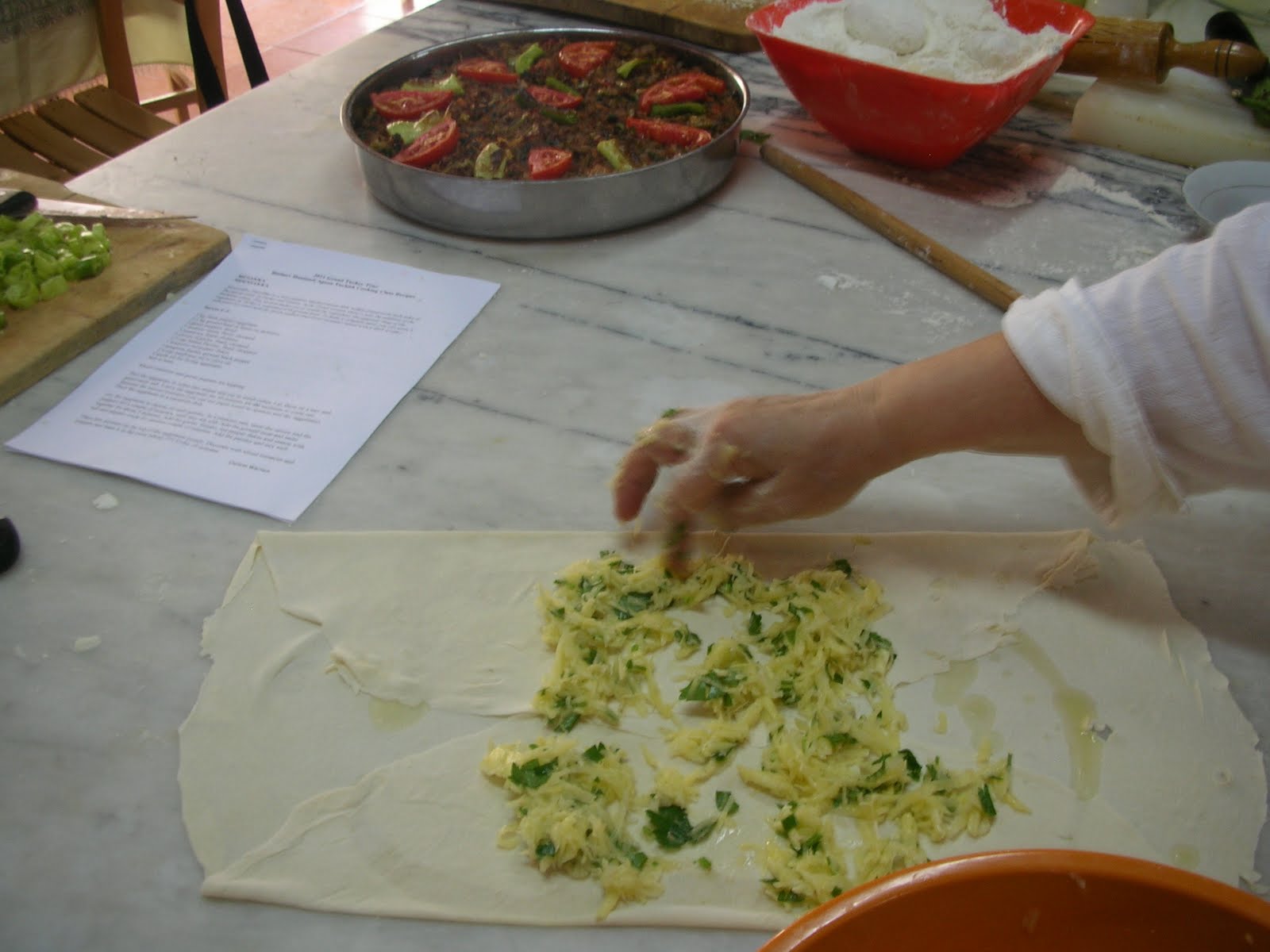 Another course we did was the Gozleme – delicious thin pastry filled with various fillings (potato and onion, spinach and onion, ground meat, onion and parsley). Here is Hatice Hanim showing us to strech the dough on the rolling pin.