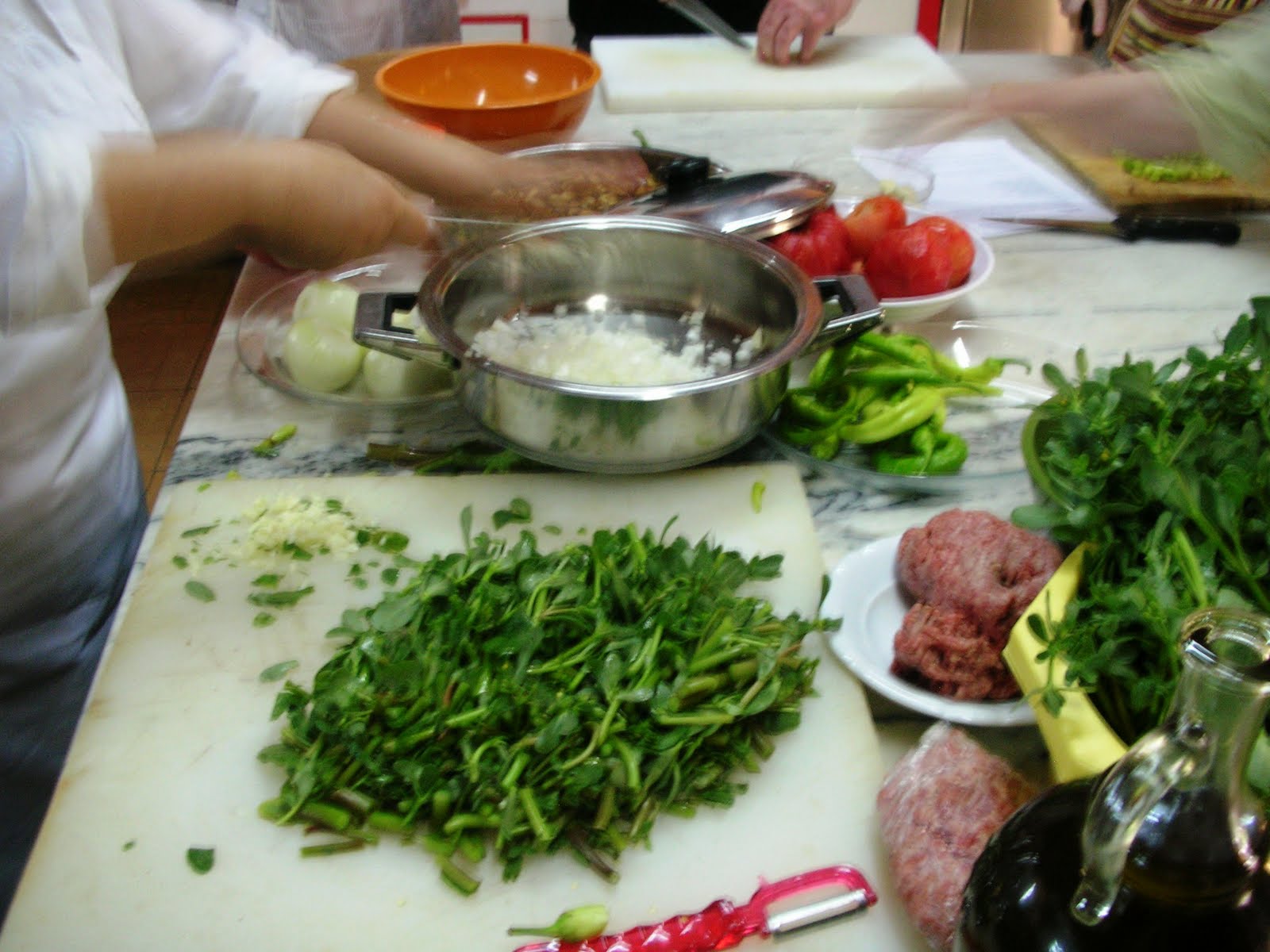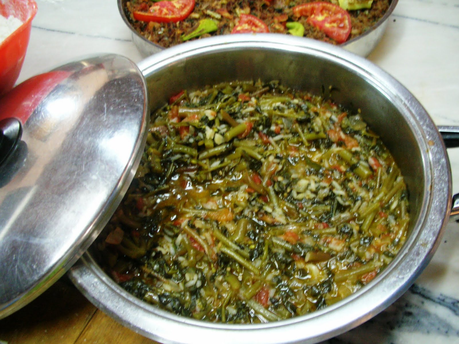 Purslane is a very common vegetable with a great, mild flavor. We cooked the purslane with sauteed onion,garlic and tomatoes in olive oil. Then we added a little rice and cooked covered for about 20 minutes. Using olive oil is the key in this vegetable course; in this style of cooking in Turkish cuisine, we simply let the vegetables cook in their own juices and with olive oil.