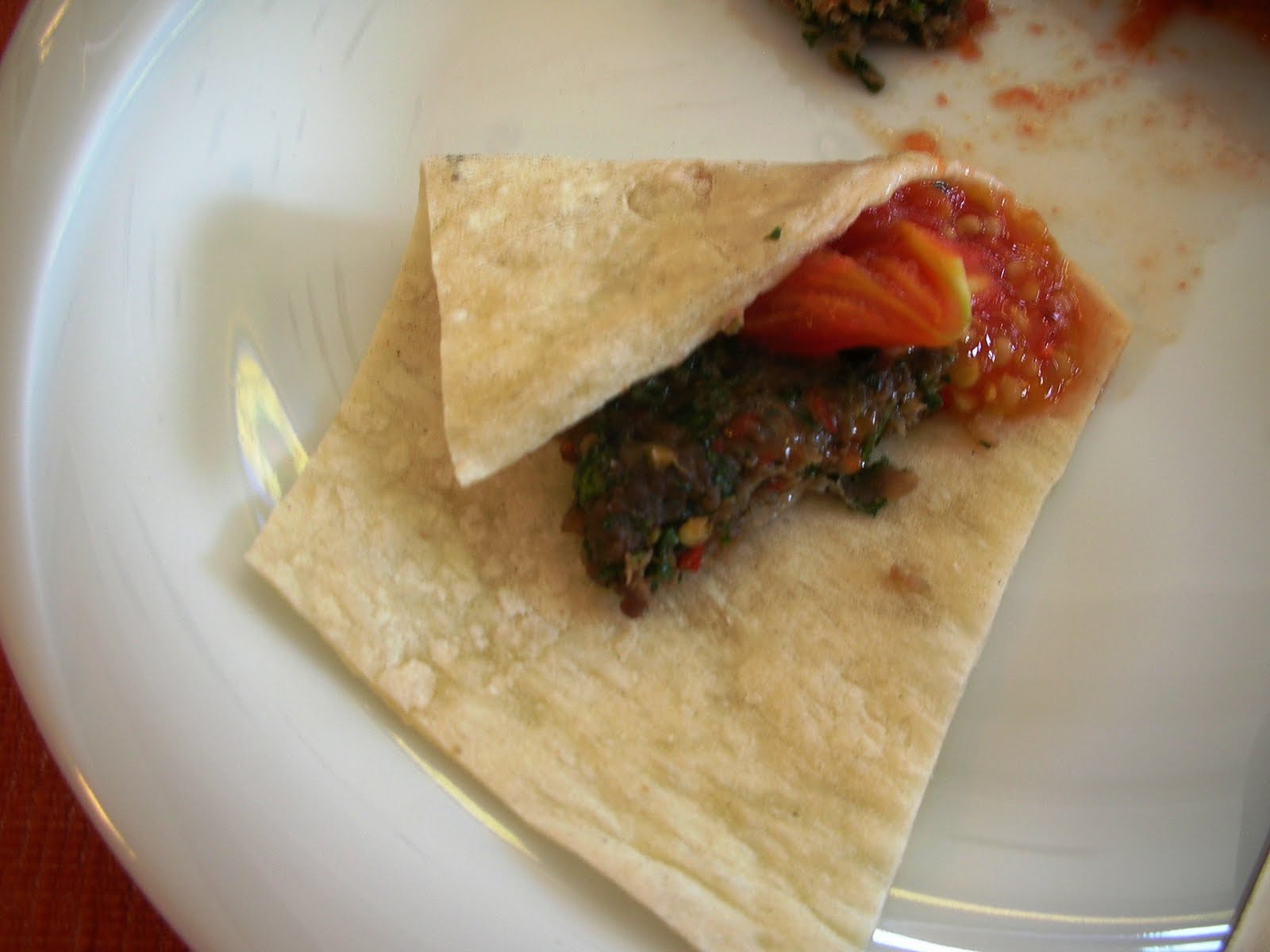 And here how we wrap a piece of kebab on the pita bread with some roasted pointy peppers or tomatoes by the side; just heavenly.