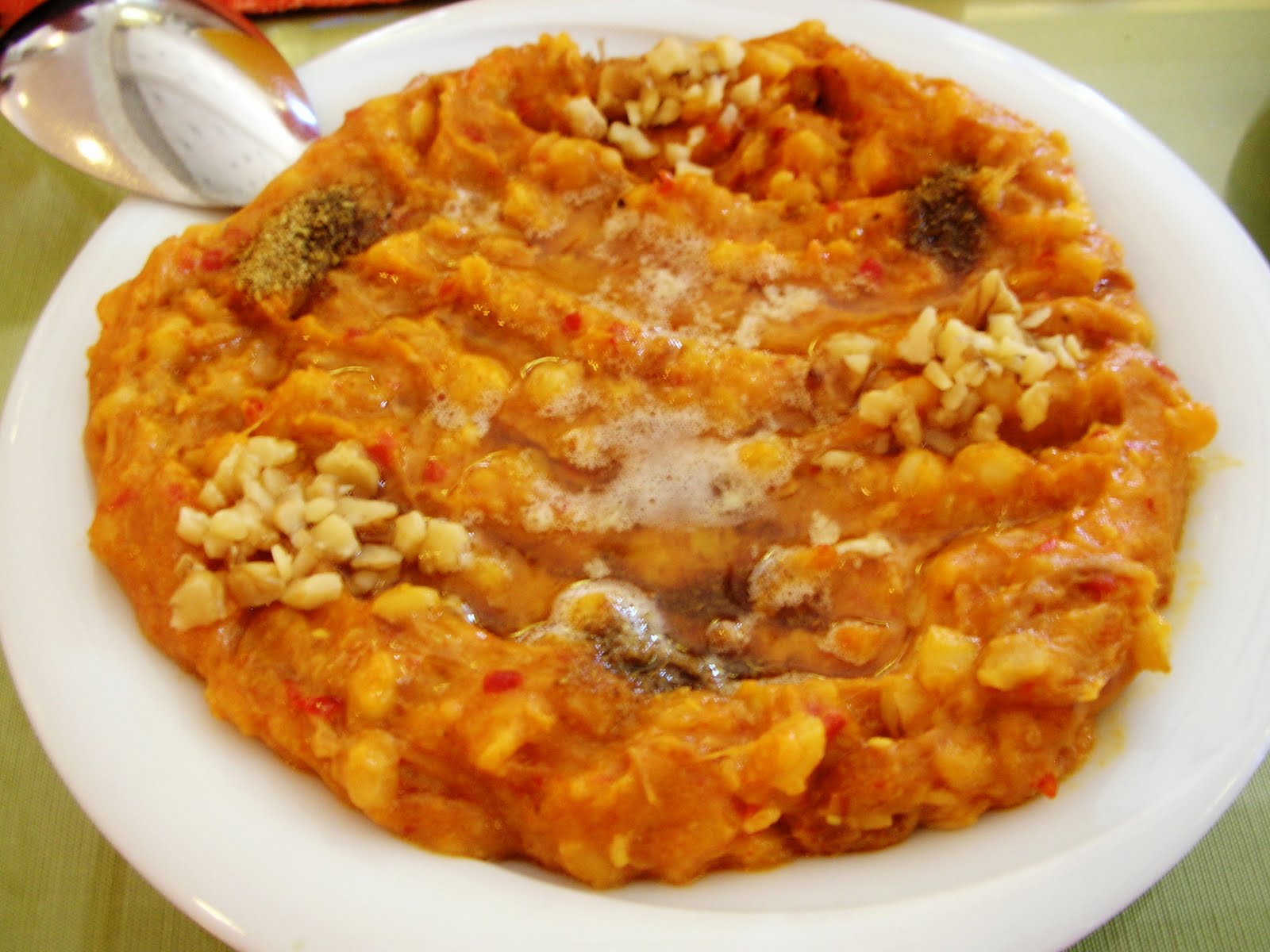 And here comes a real specialty of Antioch (Antakya); Assur (or Etli Asure). This traditional course, is also a very festive meal, that we enjoy during religious festivities. We are in Ramadan at the moment, and I am sure more Assur will be consumed at the end. In this special dish, tender meats of beef and lamb is slowly cooked with red pepper paste, bulgur wheat, chickpeas, lots of onion, cumin, red pepper flakes, ground black pepper and a little stock. Then over slow cooking and continious stirring (and moreover beating while stirring with great wooden spoons) the dish comes to a point that it is elastic and almost melt in the mouth, so good. The stirring and beating part over low heat is crucial, and I remember me and my cousins all taking turns to beat the asure during prepping when I was a child – happy days:)It is dressed with olive oil, coarsely chopped walnuts, cumin and red pepper flakes and sometimes with small raisins, like my mother does.