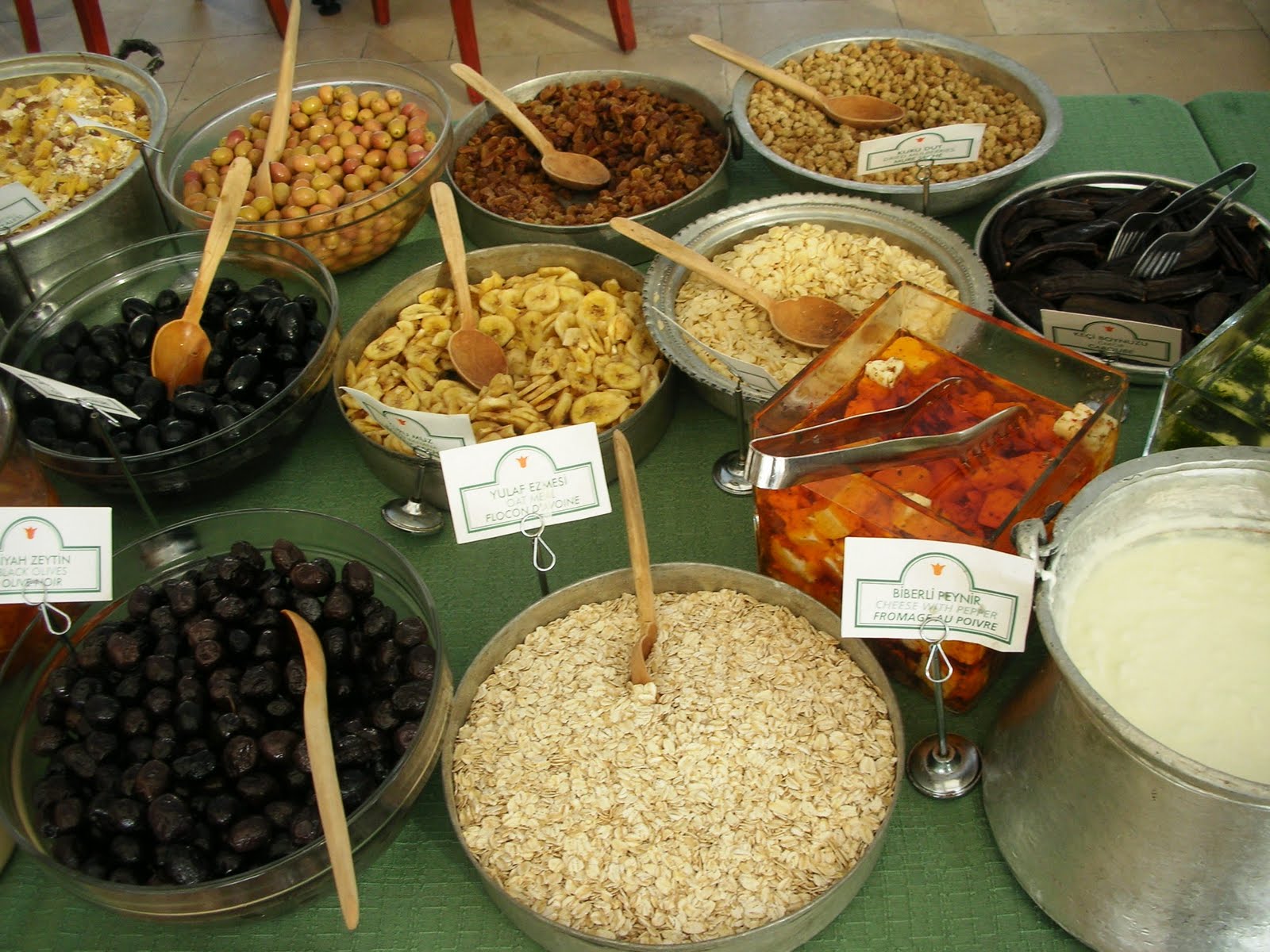 At traditional Iftar meal, sesame coated flat breads, olives, dates, Turkish sausage and pastrami (dried cured stripes of beef, coated with spices), cheese, vegetables cooked in olive oil (like stuffed cabbage leaves) is served. This is followed by soup and meat based dishes. And ends with desserts like baklava or sutlac (flaky pastry sheets soaked in a milky sauce, served with pomegranates)or fruit – quite a feast!